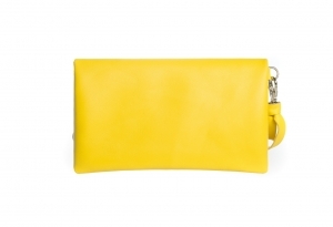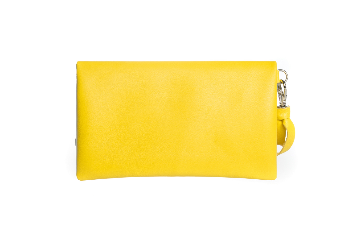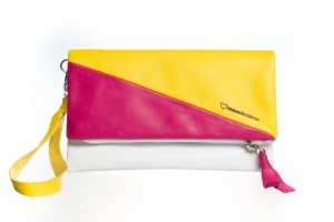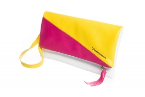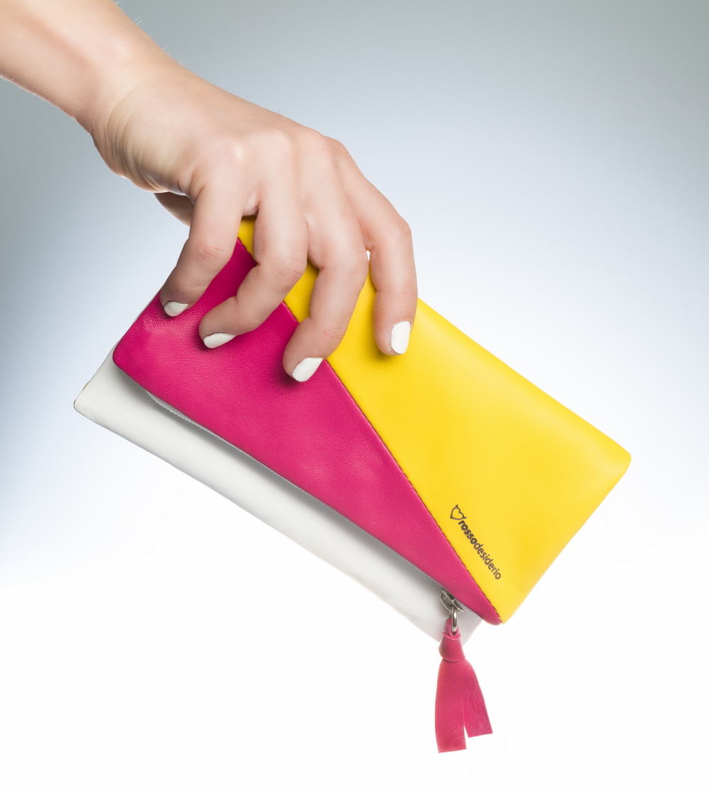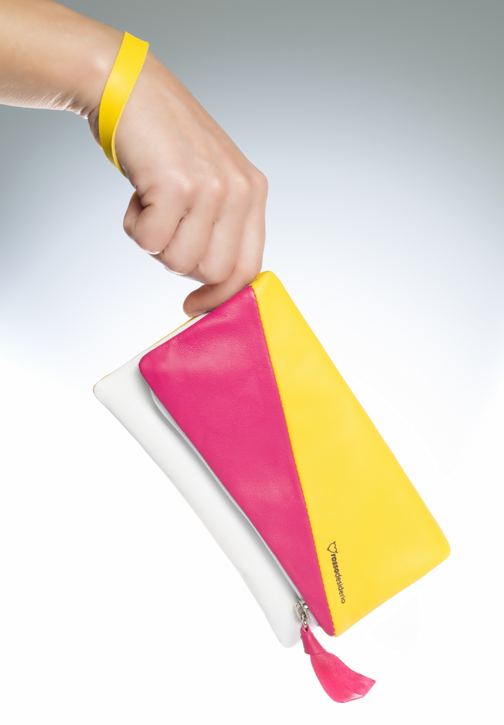 La clutch color gialla e fucsia è realizzata con pregiatissima pelle italiana. Come tutti i prodotti RossoDesiderio anche la pochette è realizzata interamente a mano in Italia.