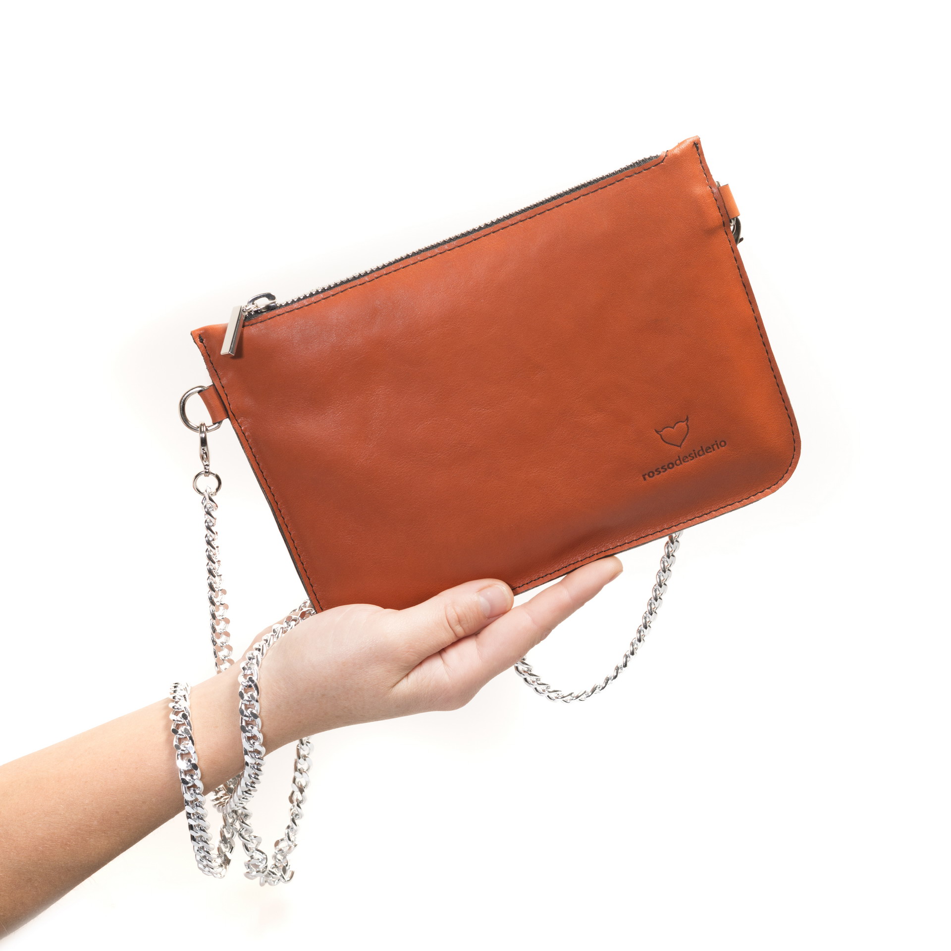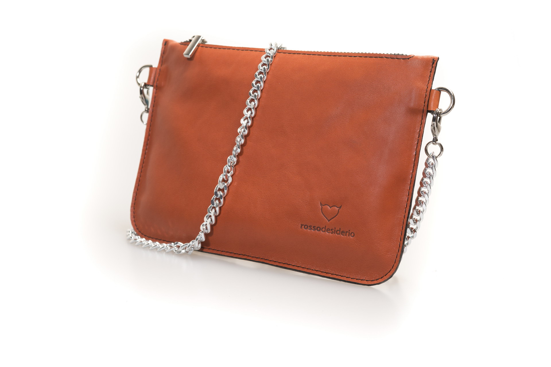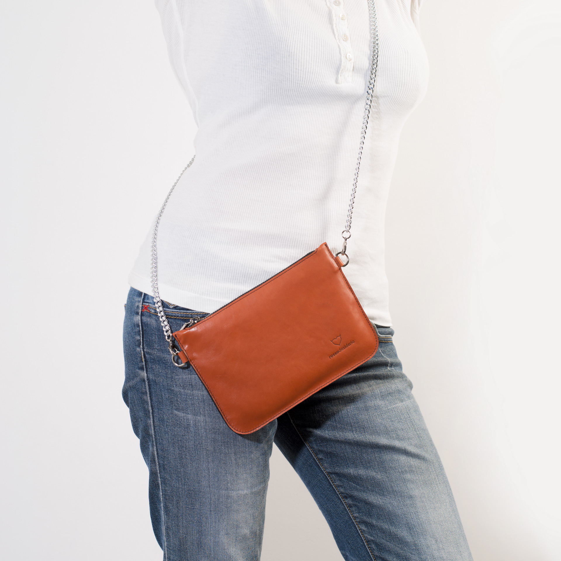 La pochette RossoDesiderio è realizzata con pregiatissima pelle italiana. Come tutti i prodotti RossoDesiderio anche questa borsetta è realizzata interamente a mano in Italia.